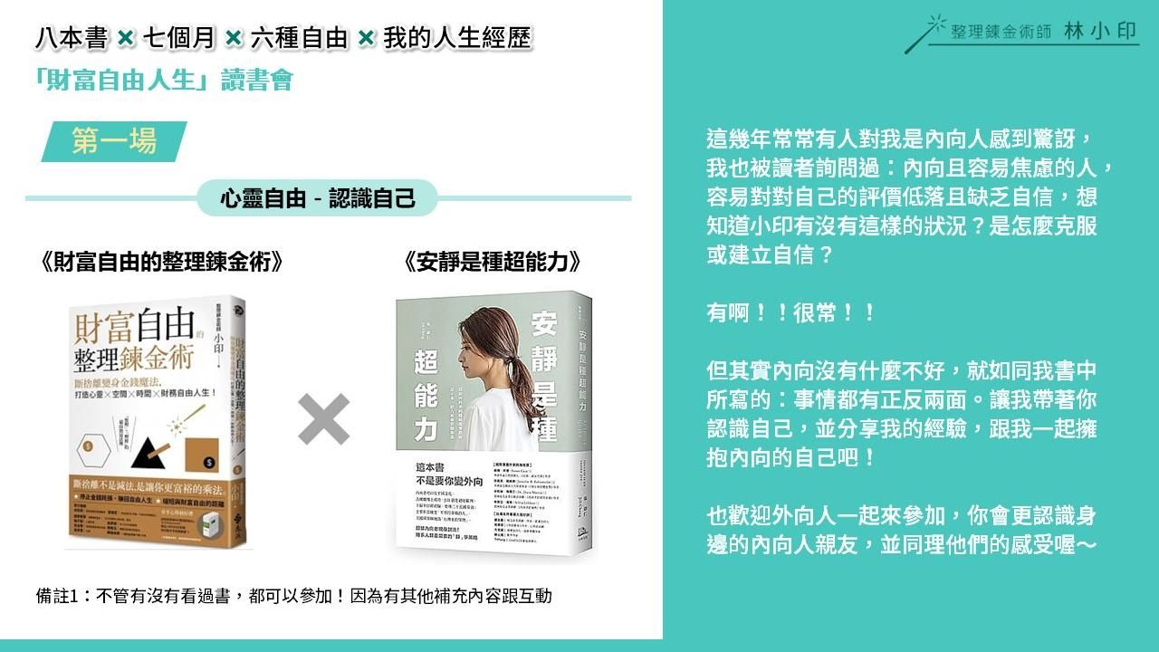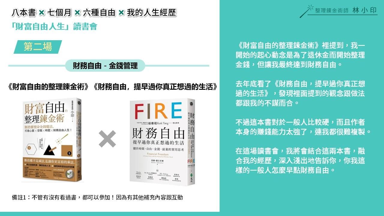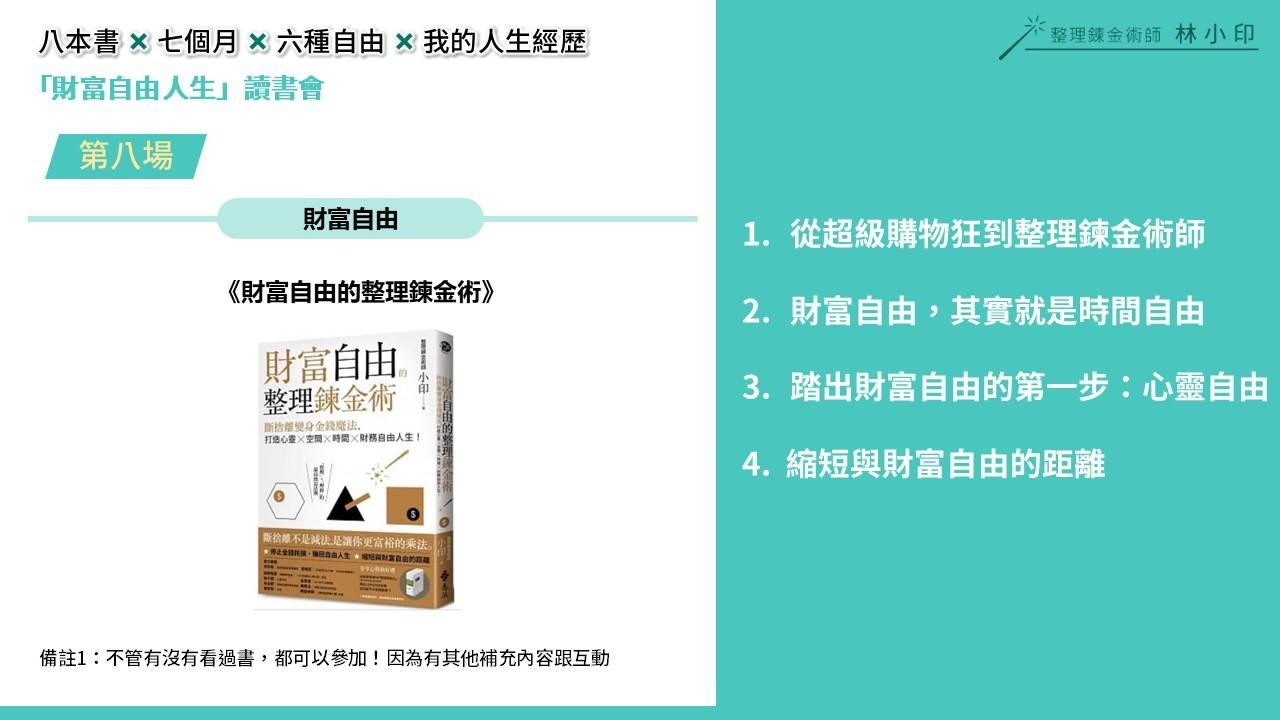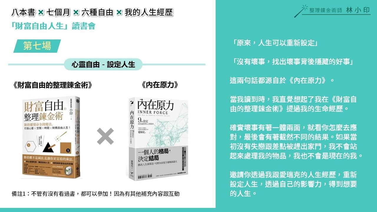 在我財富自由之後,一路上收到不少問題,所以我把這些問題統整後,找出七本書,再搭配我的新書《財富自由的整理鍊金術》跟個人經歷,做了七場線上讀書會跟一場付費的新書線上講座,廣受近300位學員好評!(上千人次觀看)