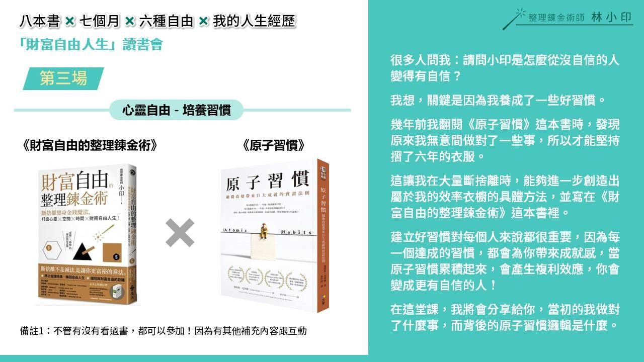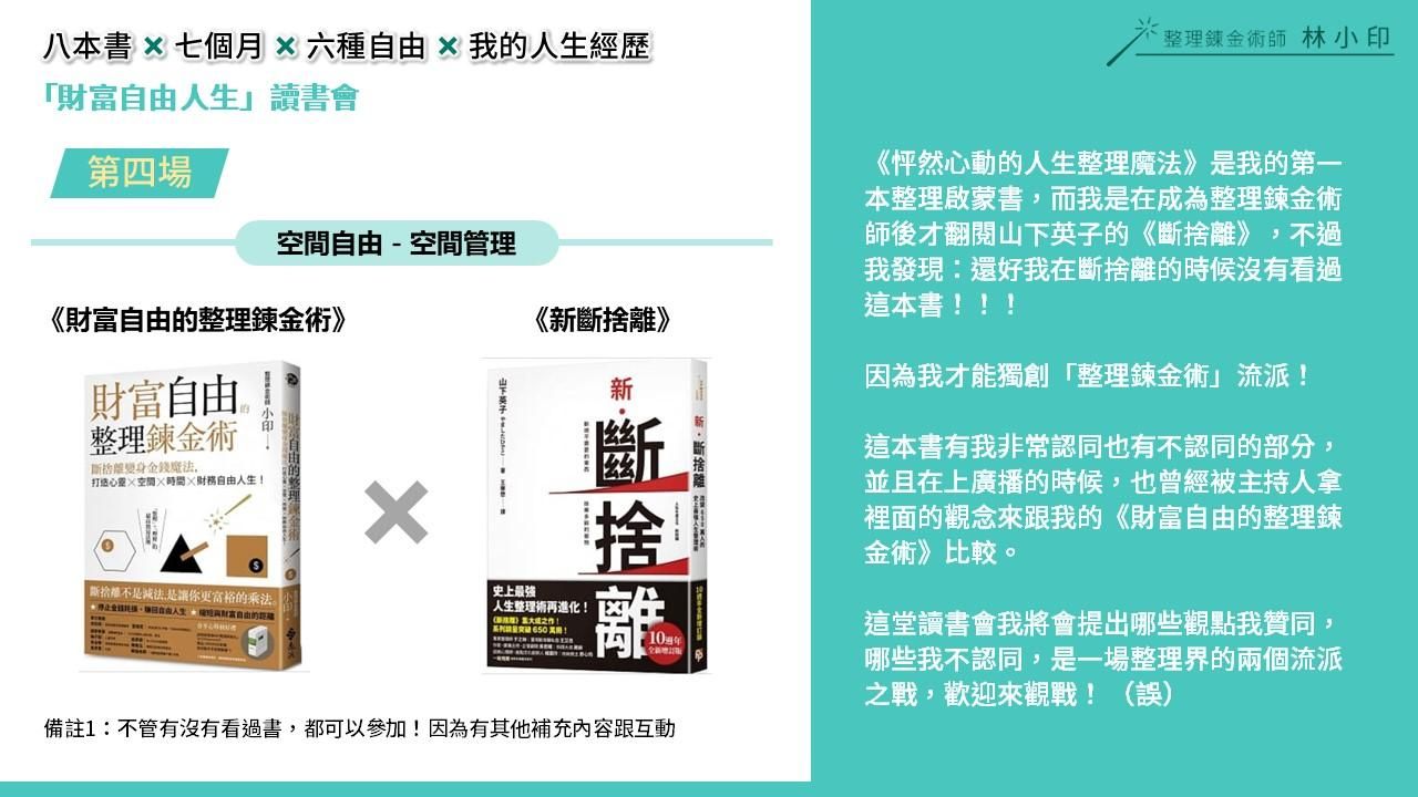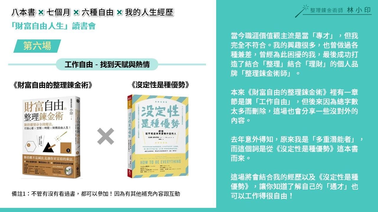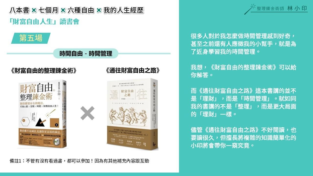 在我財富自由之後,一路上收到不少問題,所以我把這些問題統整後,找出七本書,再搭配我的新書《財富自由的整理鍊金術》跟個人經歷,做了七場線上讀書會跟一場付費的新書線上講座,廣受近300位學員好評!(上千人次觀看)