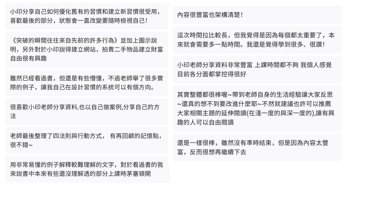 小印對書籍整體架構、重點的掌握很清晰,對於有看過書的人有更大的幫助,能再複習一次,也得到不同的視角