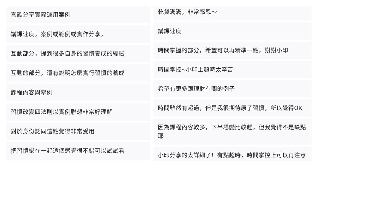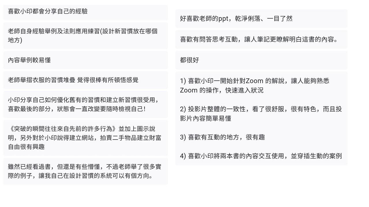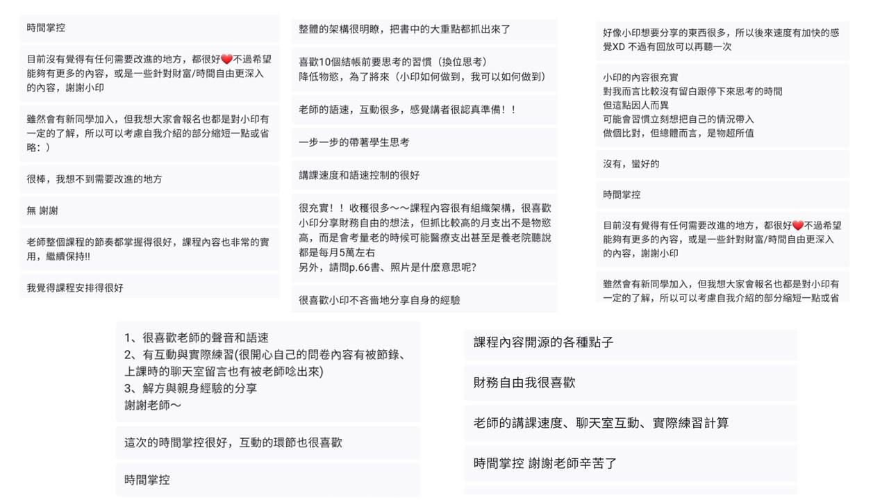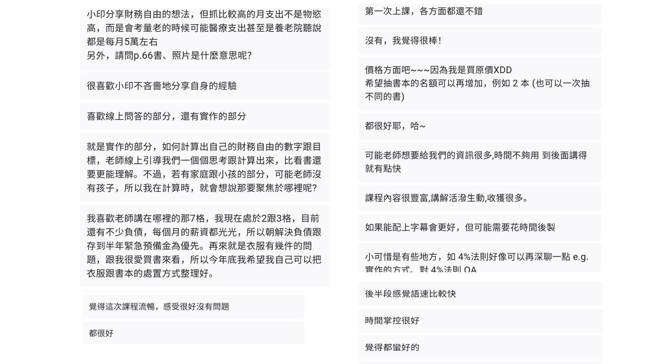 課前問卷很有幫助:對於內向不敢在課堂上表達的同學可以提前先問問題,並在課堂上獲得討論與解答的機會。謝謝~