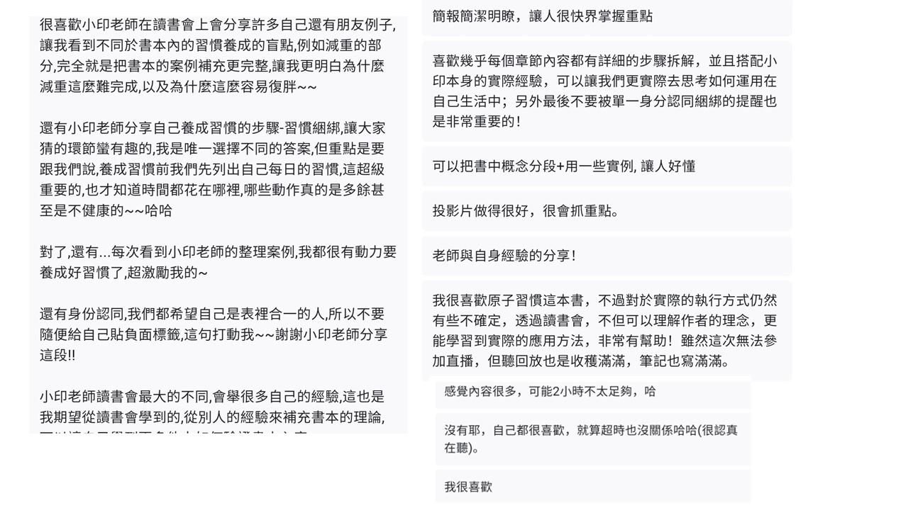 再看小印讀書會時,會去思考小印是怎麼做到的?包含設備跟思維,覺得小印可以規劃講師或寫作這方面的課了,因為小印可以用很生動又有互動的方式讓人學習,這是最佩服的地方,也很想跟小印學習,希望有一天自己也能做到。
