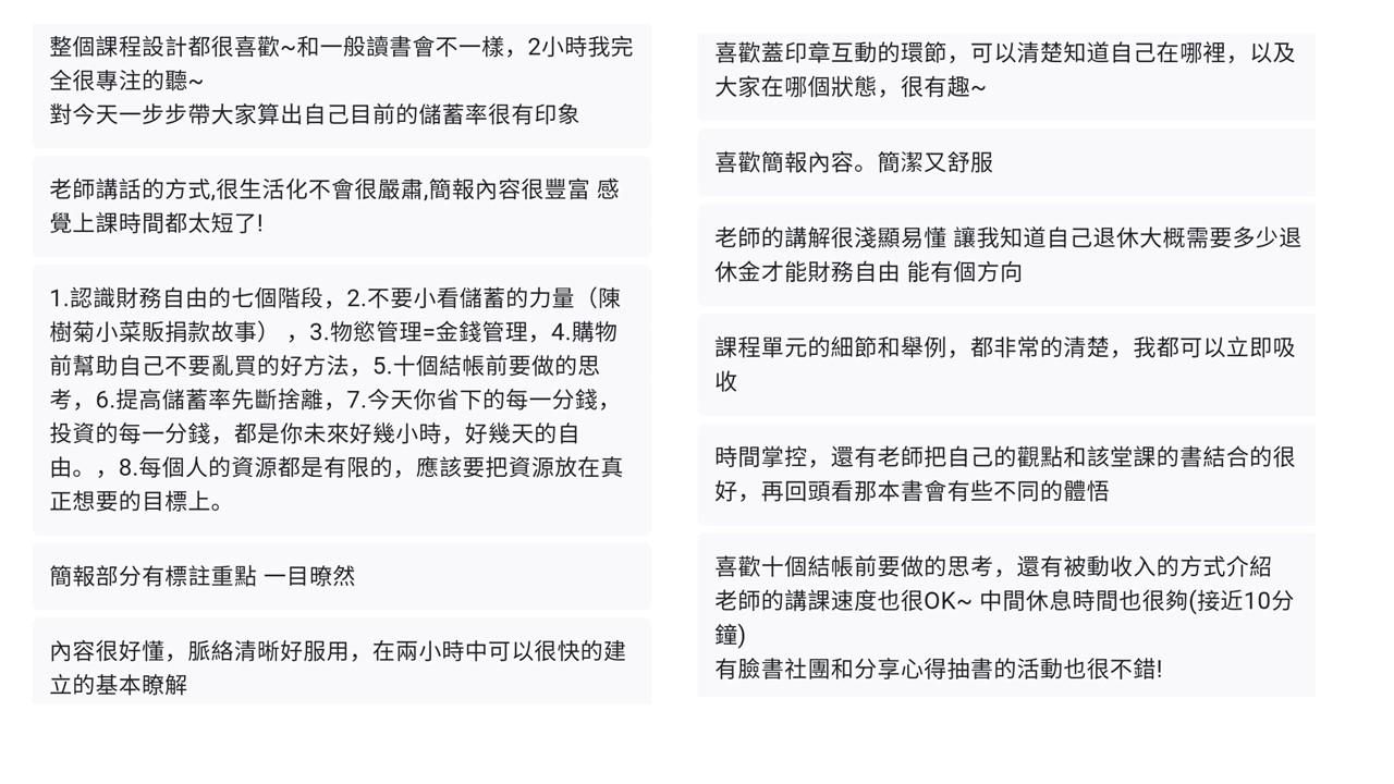 老師除了把書的重點內容擷取出來,每個說明都結合自己的真實例子,讓人更快理解。還有課程最後的問題討論居然是直接用學員課前寫的問題,覺得不論是寫的人或是聽的人都好有收穫,很有參與感。